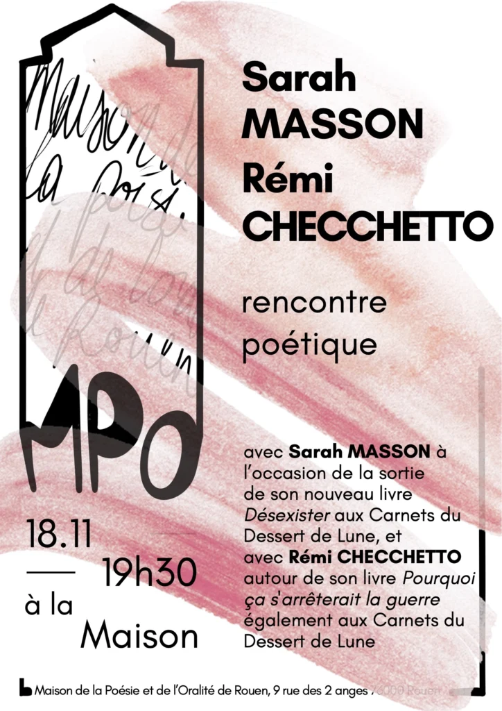 Rencontre poétique avec Sarah MASSON à l’occasion de la sortie de son nouveau livre Désexister et avec Rémi CHECCHETTO autour de son livre Pourquoi ça s arrêterait la guerre ? à la Maison de la Poésie et de l’Oralité de Rouen, 9 rue des 2 anges, 76000 Rouen.